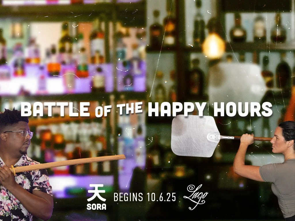 Prepare for battle! Sora is taking on our next door neighbor, Lago East Bank, in an epic battle of the happy hours! Both locations will put one drink item and one food item up to the test each week β join us to help choose a winner and be entered to win weekly prizes.
